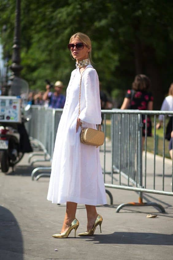 Si algo causa debilidad en las mujeres son los zapatos dorados de tacón que -llevados con un vestido blanco largo por encima de los tobillos- lucen realmente perfectos. Lo mejor que puedes hacer es decidirte por un modelo de vestido manga larga. Acompaña con un collar que sea dorado y cartera del mismo color.